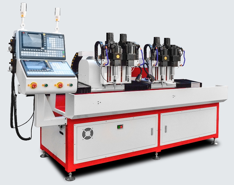 這是一臺來自浙江客戶定制的智能數控雙軸倒角機,雙工位同時檢測并補償平面度后再進行倒角加工。